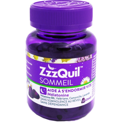 ZZZQUIL Sommeil est un complément alimentaire à base d’extraits de plantes (valériane, camomille, lavande) associé à de la mélatonine 1mg par jour et de la vitamine B6. Dans cette formule la mélatonine aide à réduire le temps nécessaire à l’endormissement*. En gommes fruitées, ZZZQUIL Sommeil sera agréable à prendre.