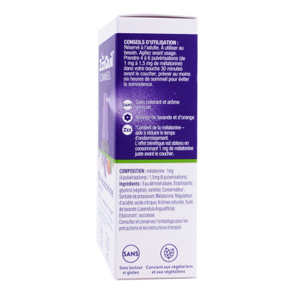 Composition : mélatonine : 1 mg pour 4 pulvérisations / 1,5 mg pour 6 pulvérisations*L'effet bénéfique est obtenu en consommant 1 mg de mélatonine juste avant le coucher.