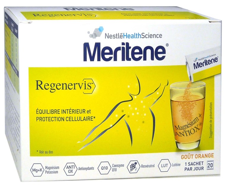 La gamme MERITENE des laboratoires Nestlé HealthScience est composée de compléments alimentaires destinés à redonner bien-être et confort au quotidien, aux personnes à partir de 50 ans. REGENERVIS est un complément alimentaire sous forme de poudre à diluer composé de vitamines, minéraux et Co-enzym Q10, resvératrol, lutéine qui améliorent l’équilibre nutritionnel, des anti-oxydants qui aident renforcer le système immunitaire et protéger les cellules de l’organisme contre le stress oxydatif, contribuent au métabolisme énergétique normal, du système nerveux et psychologique. Son arôme à l’orange permet une prise facile. Jour après jour, l’organisme retrouve du bien-être et de l’énergie.