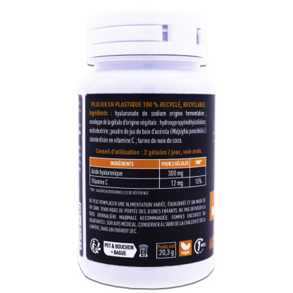 hyaluronate de sodium origine fermentation ; enveloppe de la gélule d'origine végétale : hydroxypropylméthylcellulose ; maltodextrine ; poudre de jus de baie d'acérola (Malpighia punicifolia L.) standardisée en vitamine C ; farine de noix de coco.