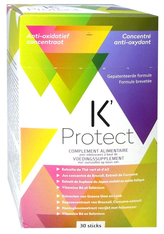 K’PROTECT des laboratoires OMEGA PHARMA est un complément alimentaire conditionné sous forme de sticks aromatisés au gout frais de jus de grenade, à base d’extraits de plantes, vitamines et minéral est traditionnellement utilisé pour ses vertus antioxydantes. Les extraits de plantes (thé vert, ail) ont pour rôle de protéger l'organisme pour mieux lutter contre l'oxydation des cellules et les agressions extérieures. Le jus concentré de brocoli, les extraits de curcuma et sophoral du japon vont assurer le bon fonctionnement du système immunitaire de l’organisme. Le sélénium aux propriétés antioxydantes assoicé à la vitamine B6 vont participer au métabolisme énergétique normal. Prendre K’PROTECT rend l’organisme plus résistant.