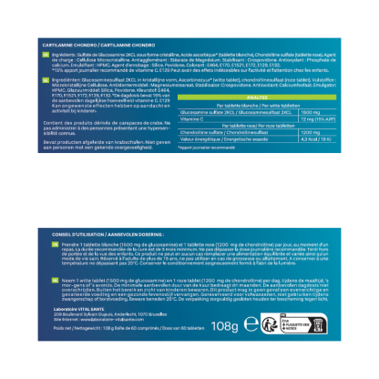 Cartilamine Chondro des laboratoire VITAL SANTE disponible en vente en ligne à prix discount sur Pharmashopdiscount, combine glucosamine, chondroïtine et vitamine C pour aider les articulations très sollicitées et le cartilage affaibli.