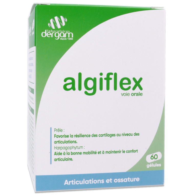 ALGIFLEX de DERGAM est un complément alimentaire à base d’extraits de plantes (Harpagophytum, prêle), chondroïtine, d’oméga 3, de calcium marin et de vitamine D. La prêle contenue dans cette formule contribue à maintenir les articulations souples et à réduire l'inflammation des articulations ainsi qu'à favoriser leur résilience. L'Harpagophytum quant à lui aide à maintenir la santé des articulations et à conserver une bonne mobilité. Enfin la vitamine D complète la formule en favorisant le maintien d'os normaux.