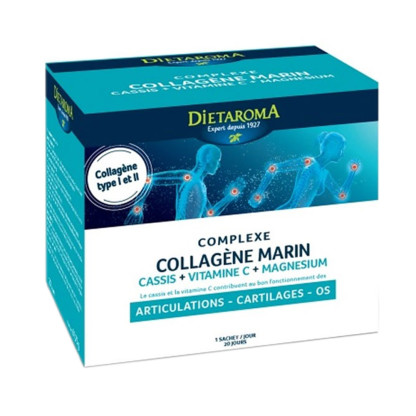 DIETAROMA COMPLEXE COLLAGENE MARIN 20 SACHETS en vente en ligne sur le site de votre parapharmacie à prix discount est un complément alimentaire destiné aux personnes pratiquant une activité sportive intense ou qui recherchent une solution naturelle lors de manque de flexibilité articulaire.