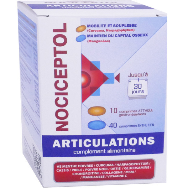 NOCICEPTOL Articulations des laboratoires POLIDIS est un complément alimentaire conditionné en 50 comprimés : 10 comprimés ATTAQUE gastro-résistants et 40 comprimés ENTRETIEN.
