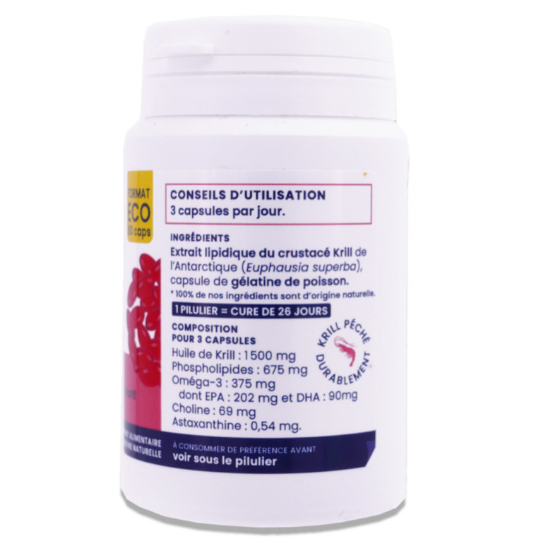 Composition pour 3 capsules : Huile de Krill : 1 500 mg Phospholipides : 675 mg Oméga-3 : 375 mg dont EPA : 202 mg et DHA : 90mg Choline : 69 mg Astaxanthine : 0,54 mg.