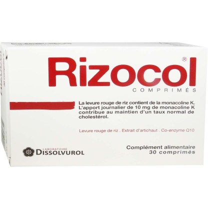 RIZOCOLdes laboratoires DISSOLVUROL est un complément alimentaire qui diminue le taux de graisses et le régule en participant au métabolisme normal des lipides grâce aux monacolines K (statines naturelles) dosé à 10mg pour 2 comprimés qui est un composant de la poudre de riz rou issu de la culture d’un champignon microscopique. Il est également riche en Coenzyme Q10 et artichaut pour renforcer les monacolines K. Réguler le taux de graisses dans le sang est important pour l’organisme. Jour après jour, la cholestérolémie s’équilibre et préserve les vaisseaux sanguins