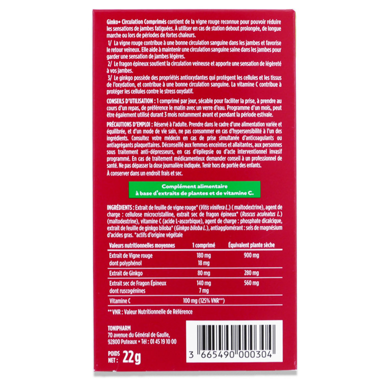 Complément alimentaire à base de vitamine C et extraits de plantesExtrait de Feuille de Vigne Rouge* (Vitis Vinifera L.) (Maltodextrine), Agent de Charge : Cellulose Microcristalline, Extrait de Sec de Fragon Épineux* (Ruscus Aculeatus L.) (Maltodextrine), Vitamine C (Acide Ascorbique), Agent de Charge : Phosphate Dicalcique, Extrait de Feuille de Ginkgo Biloba* (Ginkgo Biloba L.), Antiagglomérant : Sels de Magnésium d'Acides Gras. *actifs d'origine végétale.