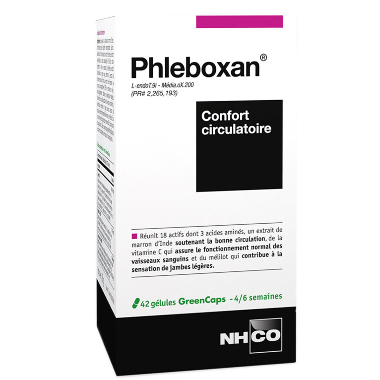 PHLEBOXAN conditionné sous forme de gélules GreenCaps est un complément alimentaire formulé à base de 18 actifs concentrés : acides aminés, vitamines et plantes. Il contient 3 complexes (L-EndoT9i, Medai.oX.200, Lymphadrain 360D à base de plantes et vitamines et d’acides aminés spécifiques. Le complexe L-EndoT9i contient de l’extrait de marron d’inde qui soutient le retour veineux dans les jambes, associé à des baies de cassis qui fortifie les vaisseaux. Le complexe Medai.oX.200 réunit du curcuma avec de la vitamines E qui protège les cellules des radicaux libres et de la vitamine C qui contribue à la formation normale de collagène utile pour le fonctionnement normal des vaisseaux sanguins. Le complexe Lymphadrain 360D est composé de feuille de vigne rouge et de mélilot qui contribue à la sensation de jambes légères ainsi que de la feuille de cassis qui a contribue à la fonction d’élimination de l’eau dans l’organisme. Ce complément alimentaire est recommandée pour une sensation de jambes légères, et une participation au drainage de l’organisme. Convient aux végétariens et aux végétaliens.