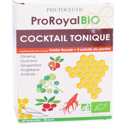 Cocktail tonique de PROROYAL BIO, le complément alimentaire conditionné sous forme d'ampoules disponible dans votre parapharmacie en ligne à prix discount.