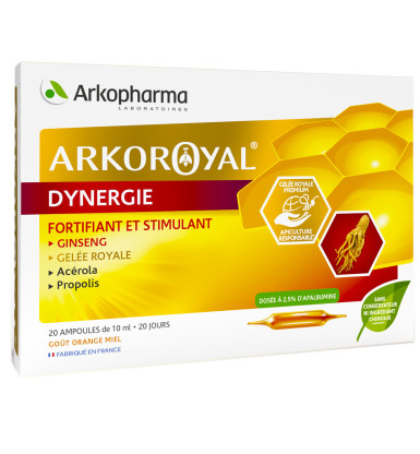 Arkoroyal Dynergie fortifiant et stimulant , conditionné sous forme d’ampoules, possède une formule concentrée comprenant de a gelée royale, substance naturelle produite par les abeilles qui est l'aliment des larves d'abeilles, mais également de la reine, pendant toute la durée de sa vie. L’espérance de vie d’une reine est de 5 ans, alors que celle de ses sujets n’excède pas 45 jours. Les ampoules contiennent aussi de l'Acérola (cerise du brésil) naturellement riche en vitamine C, de la propolis et du Ginseng.La vitamine C contribue à réduire la fatigue et au fonctionnement normal du système immunitaire. Sans colorant, sans conservateur et sans alcool.