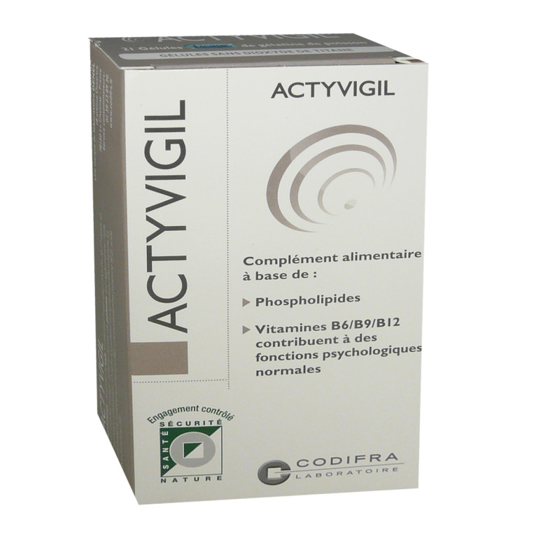 ACTYVIGIL de CODIFRA est un complément alimentaire contenant de la vitamine B5 qui contribue à des performances intellectuelles normales, et des vitamines B6, B9 et B12 qui aident à maintenir les fonctions psychologiques dans un état optimal. A cette formulation vitaminée s'ajoutent des phospholipides végétaux dosés en phosphatidylsérine (100 mg / gélule).