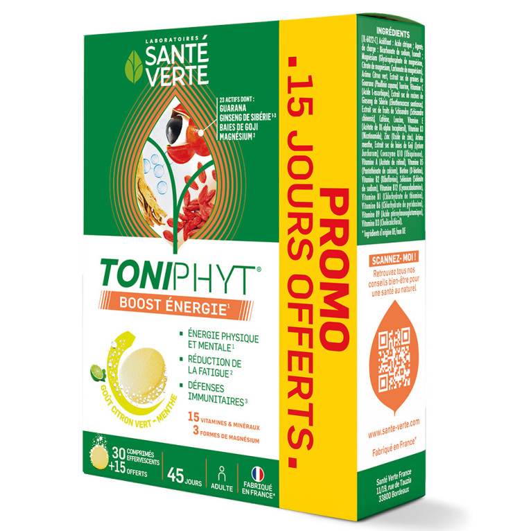 Santé verte propose des produits innovants et de haute qualité, composés de formules exclusives à base de plantes pour offrir des solutions naturelles à tous les besoins courants de santé. TONIPHYT BOOST® est un complexe de 23 actifs naturels autour du Guarana, arbuste originaire de l’Amazonie traditionnellement utilisé pour combattre la fatigue. La formule associe des extraits secs d’Eleuthérocoque et de Schisandra à de la caféïne, actifs reconnus pour leurs propriétés à réduire la fatigue mentale et physique stimuler l’organisme et les capacités intellectuelles et physiques, de la vitamine C et du magnésium viennent renforcer l’effet « booster » de TONIPHYT. Aromatisés au citron vert-menthe, ces comprimés effervescents seront un plaisir à prendre.