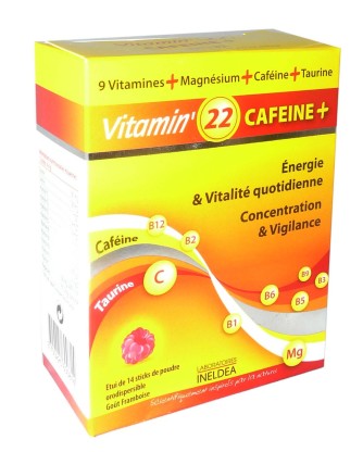 VITAMIN 22 CAFÉINE + ÉNERGIE INSTANT du laboratoire INELDEA a été spécialement formulé à base de caféine qui aide à réduire la fatigue mentale, à accroître la vigilance et à améliorer la concentration. La formule est complétée par du Magnésium qui contribue au fonctionnement normal du système nerveux et à des fonctions psychologiques normales et par de la Vitamine B3 qui, avec le Magnésium, participe au métabolisme énergétique. VITAMIN 22 CAFÉINE + combine les vitamines B2, B3, B5, B6, B12 et C et le Magnésium, contribuant ensemble à réduire la fatigue.Ce complément alimentaire contient 14 sticks à avaler sans eau et à prendre sur 14 jours.