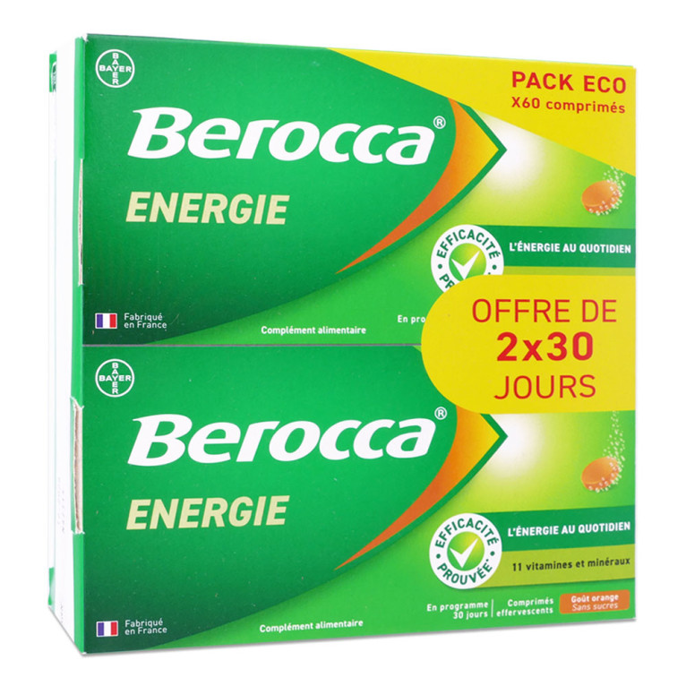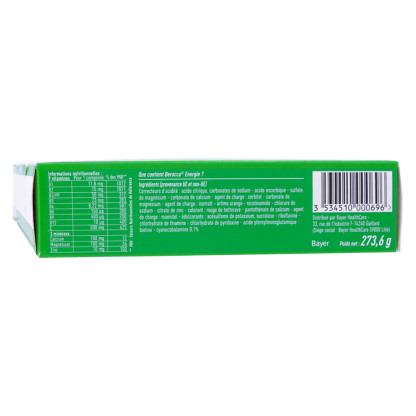 Berocca Energie des laboratoires BAYER est un complément alimentaire sous forme de comprimés effervescents, riche en vitamines et minéraux (vitamines B et C, magnésium, calcium, zinc). Les vitamines B9 et C contribuent à réduire la fatigue et le zinc contribue au fonctionnement cognitif normal. Son goût à l’orange sans sucre plaira à tout le monde et Berocca Energie pourra être pris en cas de fatigue passagère, activités physiques, ou d'activité de concentration.