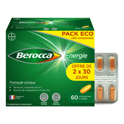 BEROCCA ENERGIE des laboratoires BAYER est un complément alimentaire sous forme de comprimés à avaler, riche en vitamines et minéraux (vitamines B et C, magnésium, zinc). Les vitamines B9 et C contribuent à réduire la fatigue et le zinc contribue au fonctionnement cognitif normal. Berocca Energie pourra être pris en cas de fatigue passagère, activités physiques, ou d'activité de concentration.