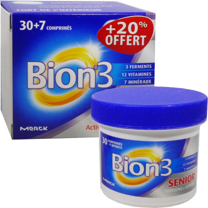 La gamme BION des laboratoires MERCK MEDIFLOR est composée de compléments alimentaires pour redonner du tonus lors de fatigue passagère et pour les maux du quotidien de toute la famille. BION 3 défenses Sénior diminue les périodes de fatigue notamment lors de changement de saison ou de baisse d’énergie, renforce le système immunitaire, et protège l’organisme du stress oxydatif, et participe également au maintien de la bonne vision, grâce aux 12 vitamines (A, B, C, D et E) et 7 minéraux (iode, fer, zinc, sélénium, chrome, manganèse, molybdène), aux 3 ferments Tri-Bion brevetés (Lactobacillus gasseri PA16/8, Bifidobacterium bifidum MF 20/5, Bifidobacterium longum SP07/3), ainsi qu’aux extraits de ginseng, myrtille et à la lutéine. L’organisme est plus fort et plus résistant aux périodes difficiles, il retrouve tonus et vitalité.