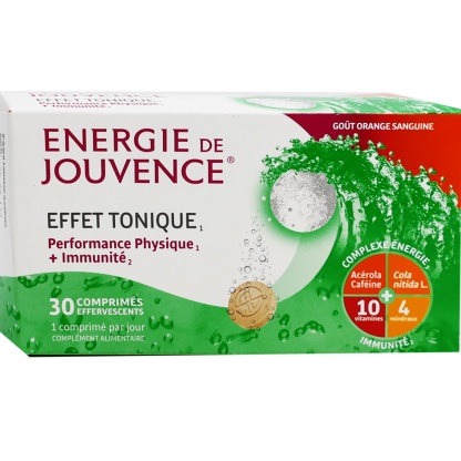 ENERGIE DE JOUVENCE Effet Tonique est un complément alimentaire en comprimés effervescent au bon goût d’orange sanguine. Sa formule apporte des Vitamines C, B1, B2, B3, B5, B6, B8, B12, du cola nitida, et des minéraux (calcium, manganèse, magnésium, fer). Dans cette formule le cola possède des propriétés stimulantes et toniques qui contribuent à la résistance contre la fatigue mentale et physique. Enfin les vitamines C, B ainsi que les minéraux participent ensemble à un métabolisme énergétique normal ains qu’au fonctionnement normal du système immunitaire.
