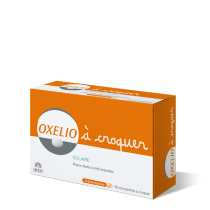 OXELIO à croquer des laboratoires JALDES, le complément nutritionnel spécialement conçu pour préparer la peau à l’exposition solaire et favoriser le bronzage, goût banane adapté aux plus jeunes.