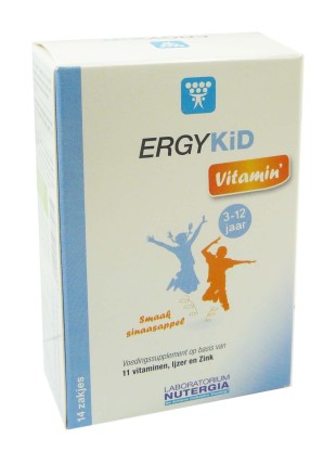 ERGYKID’ Vitamin du laboratoire NUTERGIA est un complément alimentaire conditionné en sachet au goût d' orange spécialement conçu pour compléter les apports en vitamines des enfants. La formule d’ERGYKID’ Vitamin est composée d’un complexe de vitamines et de minéraux comprenant des vitamines B1, B2, B3, B5, B6, B8, B9 et B12, vitamine E naturellen du fer, du zinc ainsi que de l'acérola , petit fruit rouge contenant de la vitamine C.