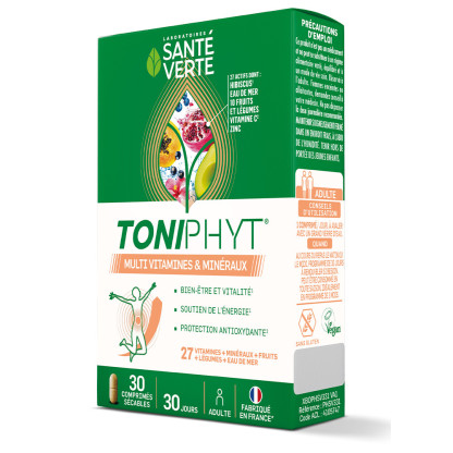 TONIPHYT Multinature Bien-être et Vitalité des Laboratoires SANTE VERTE, le complément alimentaire conditionné sous forme de comprimés à base de vitamines, minéraux, d'extraits de plantes et d'eau de mer, disponible dans votre parapharmacie en ligne à prix discount.