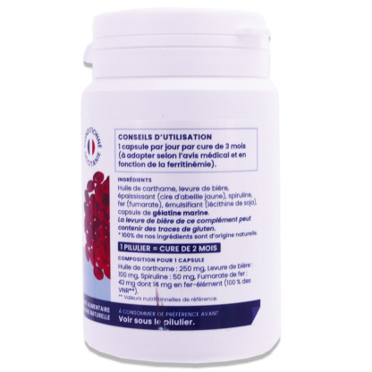 Ingrédients : huile de carthame, levure de bière, épaississant (cire d’abeille jaune), spiruline, fer (fumarate), émulsifiant (lécithine de soja), capsule de gélatine marine. La levure de bière de ce complément peut contenir des traces de gluten. Composition pour 1 capsule : Huile de carthame : 250 mg, Levure de bière : 100 mg, Spiruline : 50 mg, Fumarate de fer : 42 mg dont 14 mg en fer-élément (100% des VNR*).