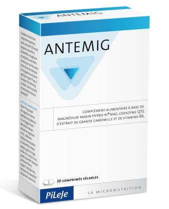 La gamme des Spécifiques de PILEJE est composée de compléments alimentaires et produits dermatologiques et cosmétiques à base d’ingrédients naturels pour apporter confort et bien-être au quotidien. ANTEMIG est un complément alimentaire riche en magnésium marin, coenzymes Q10, vitamine B6 et extrait de grande camomille. Le magnésium issu de la mer Morte est riche en sels minéraux , il contribue au fonctionnement normal du système nerveux et de la fonction cognitive et à diminuer la fatigue passagère.