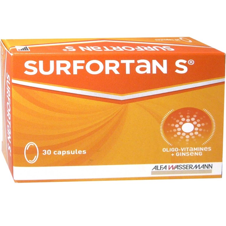 SURFORTAN S des laboratoires Alfa Wasserman Pharma est un complément alimentaire sous forme de capsules à avaler, composé d’extrait de ginseng fortement dosé (tiré de racines de Panax Ginseng Meyer), d’oligo-éléments, de DHA et de vitamines. Dans cette formule, on retrouve des vitamines du groupe B, notamment des vitamines B1, B2, B5, B8 et B9, et du fer. La formulle associe également du sélénium et des vitamines C et E qui contribuent à la protection des cellules contre le stress oxydatif.