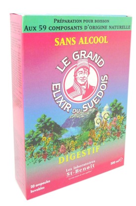 Le docteur SAMST, célèbre médecin suédois du XVIIIème siècle reconnu pour ses nombreuses recherches en botanique, a adapté une formule mise au point par Gallien médecin grec considéré comme le père de la pharmacie, et a créé le Grand Elixir du Suédois. Il s’agit d’une association exceptionnelle de 59 composants naturels dont une préparation vénitienne avec des plantes, du miel, du citron, de l’angélique, de la rhubarbe, du camphre, de la myrrhe, de l’aloès, du safran. Cette version conditionnée en ampoules buvables est sans alcool et contient de la bardane qui contribue à faciliter la digestion.
