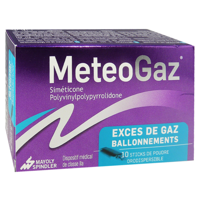METEOGAZ Excès de gaz ballonnement des laboratoires Mayoly Spindler, le dispositif médical pour prévenir et soulager les maux de ventre de toute la famille : gaz, ballonnements,… A partir de 15 ans