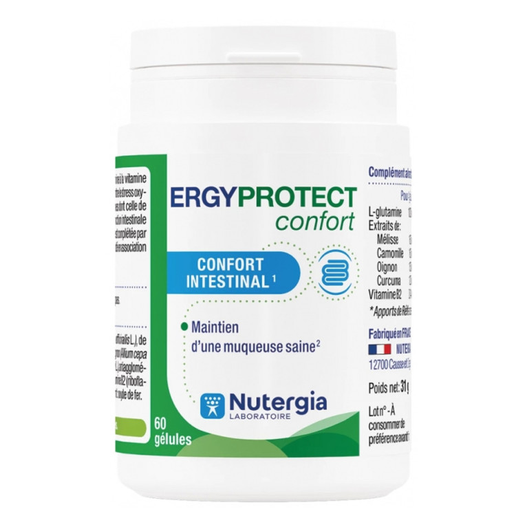 Le complément alimentaire ErgyProtect Confort Intestinal du laboratoire NUTERGIA, est composé de vitamine B2, qui contribue au maintien des muqueuses saines, et de mélisse, qui aide à une fonction intestinale normale.
