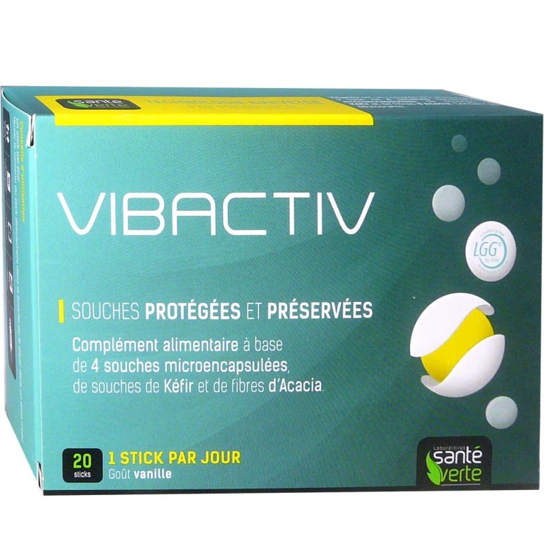 Le laboratoire SANTE VERTE propose des compléments alimentaires à base de plantes, vitamines,… pour le bien-être et les besoins au quotidien. VIBACTIV est un complément alimentaire composé de 4 souches de probiotiques microencapsulées, de souches de kéfin, et de fibres d’acacia aux différentes propriétés sur l’organisme. Il diminue les inconforts gastro-intestinaux en rééquilibrant et assainissant la flore intestinale et le système digestif conseillé après un traitement d’antibiotiques, diminue l’inflammation des inconforts intestinaux, facilite l’élimination des Candidas Albicans, et participe au renforcement des défenses naturelles de l’intestin. Microencapsulées, les souches de probiotiques, permettent de résister aux conditions difficiles dans l’organisme comme l’acidité gastrique dans l’estomac, et de rester intact dans les sticks jusqu’à utilisation. Pratique par sa forme, cette poudre orodispersible au goût de vanille se prend sans rajout d’eau, à mettre directement dans la bouche pour un effet rapide sur l’organisme. Sans gluten