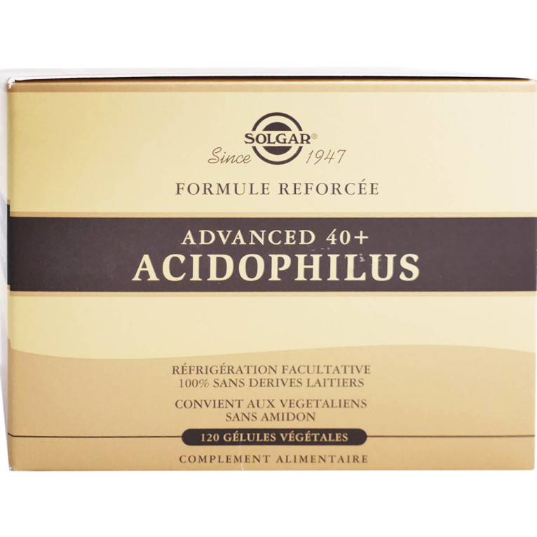 ADVANCED 40+ ACIDOPHILUS conditionné sous forme de gélules, est un complément alimentaire qui fournit 1,5 milliard de micro-organismes issus de 5 souches de ferments lactiques (L-acidophilus LA-5®, L-rhamnosus LGG® , L-paracasei L.CASEI 431®, B-lactis BB-12® et S-thermophilus TH-4®) par comprimé. ADVANCED 40+ ACIDOPHILUS de SOLGAR convient aux végétariens et aux végétaliens et est garanti sans sucre et amidon et sans gluten.