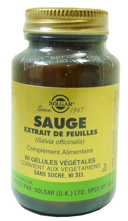 Le laboratoire SOLGAR conçoit des compléments alimentaires pour le bien-être de tous avec des ingrédients naturels et convenant aux végétariens pour les besoins de l’organisme. Sauge est un complément alimentaire conditionné sous forme de gélules végétales, composé d’extrait de feuilles de sauge qui est une plante riche en flavonoïdes, pour diminuer les symptômes liés à la ménopause (bouffées de chaleur, transpiration abondante). Sans gluten, sans sucre, sans levure, sans blé, sans soja, sans dérivés laitiers, sans colorants artificiels, sans arômes artificiels, sans conservateurs.