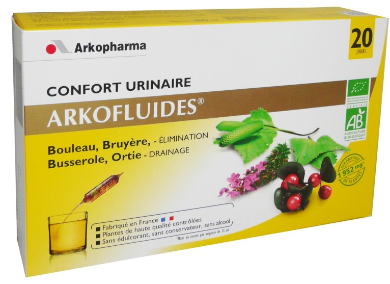 Arkofluides confort urinaire est un complément alimentaire qui se présente sous forme d’ampoules à boire, joue un rôle important sur le système urinaire. Il est composé de bouleau et de bruyère aux propriété diurétiques pour favoriser le drainage de l’organisme et l’élimination. Associé à la busserole et à l’ortie, ce complément alimentaire va rétablir l'équilibre du système urinaire et permettre de retrouver bien-être et confort lors de l'élimination de l'urine.