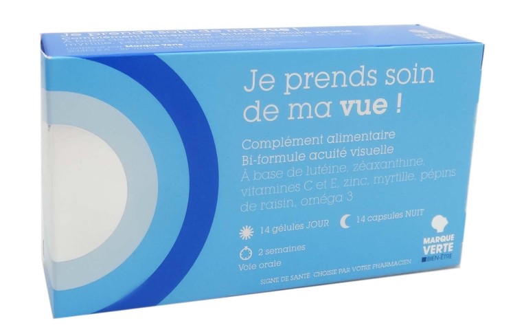 Je prends soin de ma vue de MARQUE VERTE, le complément alimentaire source de vitamines, minéraux, extraits de plantes et omégas 3 pour maintenir une bonne santé oculaire.