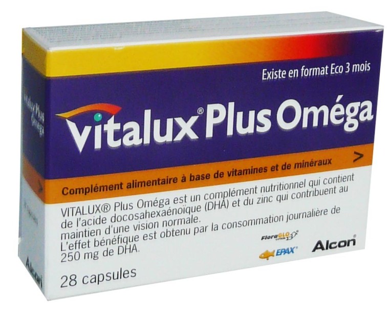 Le laboratoire ALCON conçoit des produits ophtalmologiques à destination de toute la famille pour améliorer la qualité de la vue au quotidien. Ce complément alimentaire sous forme de capsules, composé de vitamines (C et E), lutéine, zéaxanthine qui est un composant du pigment maculaire, oligoéléments, d’oméga 3 et minéraux (zinc, sélénium, chrome), va protéger les yeux des agressions extérieures en neutralisant les radicaux libres pour lutter contre le vieillissement prématuré par leur propriétés antioxydantes. Associé au zinc et à l'acide docosahexaénoïque (DHA), VITALUX PLUS OMEGA va conserver la bonne vision pour un confort au quotidien.