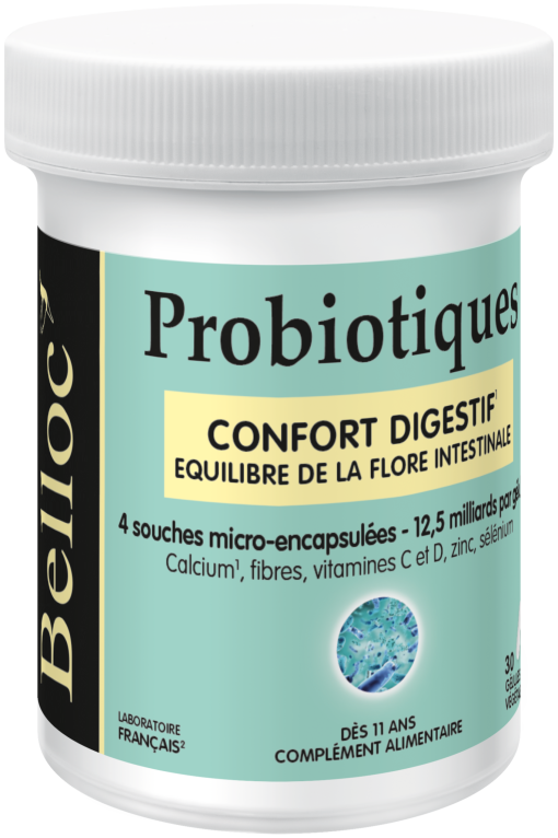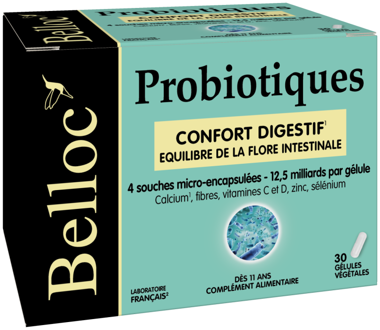 BELLOC PROBIOTIQUES est un complément alimentaire qui contient de 4 souches microbiotiques dosés à 12,5 milliards par gélules végétales qui sont associés à des minéraux (calcium, vitamines D3 et C), zinc et sélénium. Le calcium va contribuer au fonctionnement normal des enzymes digestives ; les vitamines, le zinc et le sélénium s’associent pour contribuer au fonctionnement normal du système immunitaire de l’organisme. Pour des résultats efficaces, les souches microbiotiques de BELLOC PROBIOTIQUES sont lyophilisées et microencapsulées pour les protéger de l’acidité gastrique et ainsi arriver dans l’intestin vivantes ; elles sont enregistrées dans les collections internationales (NCIMB).