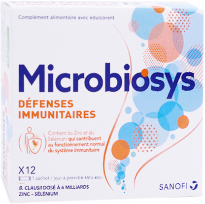 MICROBIOSYS Défenses Immunitaires discount des laboratoires SANOFI AVENTIS, le complément alimentaire sous forme de sachet dans votre parapharmacie en ligne à prix discount à base de Zinc et de Sélénium qui contribuent au fonctionnement normal du système immunitaire.