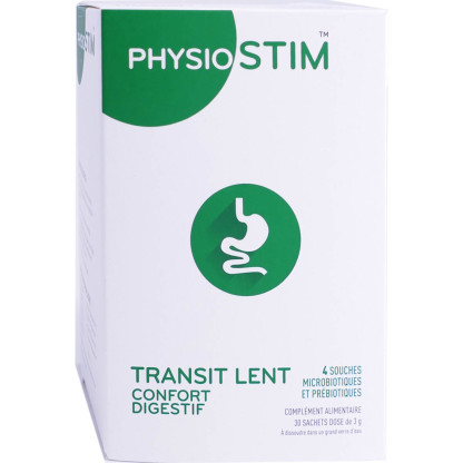 PHYSIOSTIM Transit Lent Confort Digestif des laboratoires IMMUBIO discount, un complément alimentaire à base de souches microbiotiques et prébiotiques dans votre parapharmacie en ligne à prix discount.