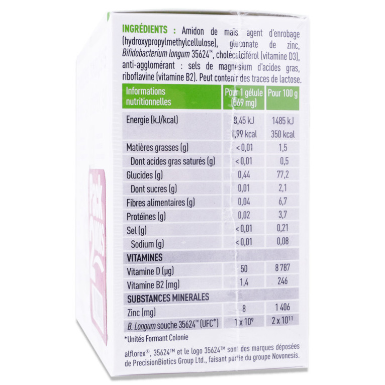 Amidon de maïs, agent d’enrobage (hydroxypropylmethylcellulose), gluconate de zinc, Bifidobacterium longum 35624™, cholécalciférol (vitamine D3), anti-agglomérant : sels de magnésium d'acides gras, riboflavine (vitamine B2).Peut contenir des traces de lactose.