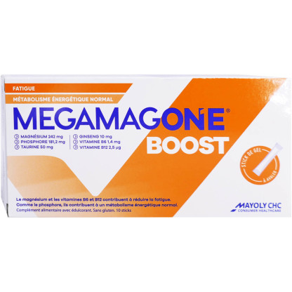 MEGAMAGONE BOOST Fatigue Métabolisme énergétique normal des laboratoires Mayoly Spindler à prix discount, un complément alimentaire à base de Magnésium, Phosphore, vitamines B, taurine et ginseng en ligne dans votre parapharmacie discount.