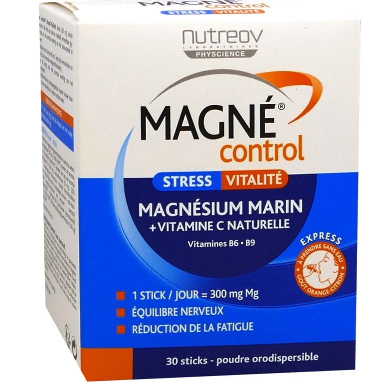 Magné Control Stress Vitalité du laboratoire NUTREOV, est un complément alimentaire composé de vitamine B9, qui contribue au système immunitaire, et de magnésium et des vitamines C et B6, qui aide à l’équilibre nerveux.
