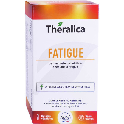 Fatigue de THERALICA est un complément alimentaire sous forme de gélules composé de coenzyme Q10, de Taurine, de Vitamines, d'extraits secs de plantes concentrées et de minéraux (Zinc, Sélénium, Magnésium)Le magnésium contribue à réduire la fatigue.