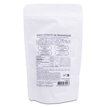 Complément alimentaire à base de magnésium, vitamine B6 et taurine. Bisglycinate de magnésium, gélule végétale (Hydroxypropylméthylcellulose), L-taurine, pyridoxine (B6).