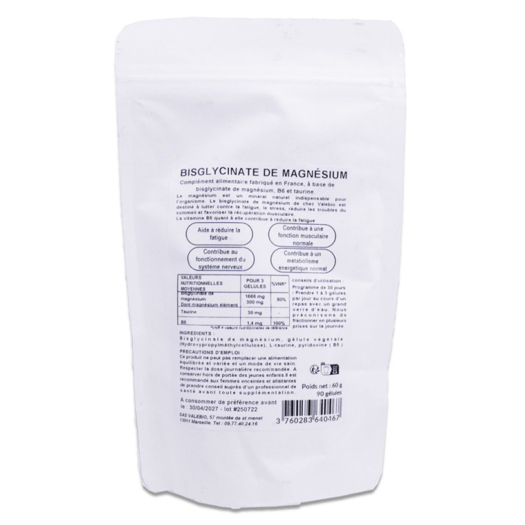 Valebio est une marque reconnue pour ses compléments alimentaires de haute qualité. Ce produit contient du magnésium bisglycinate, une forme hautement biodisponible qui assure une absorption de 60 à 80 %, nettement supérieure à d'autres formes de magnésium. Le magnésium contribue à réduire la fatigue et participe au bon fonctionnement du système nerveux. La vitamine B6, présente dans ce complément, soutient le métabolisme énergétique et contribue à réduire la fatigue. La taurine, un acide aminé naturellement présent dans l'organisme, est également incluse pour renforcer les effets du magnésium. Ensemble, ces ingrédients sont formulés pour vous apporter un soutien quotidien efficace.