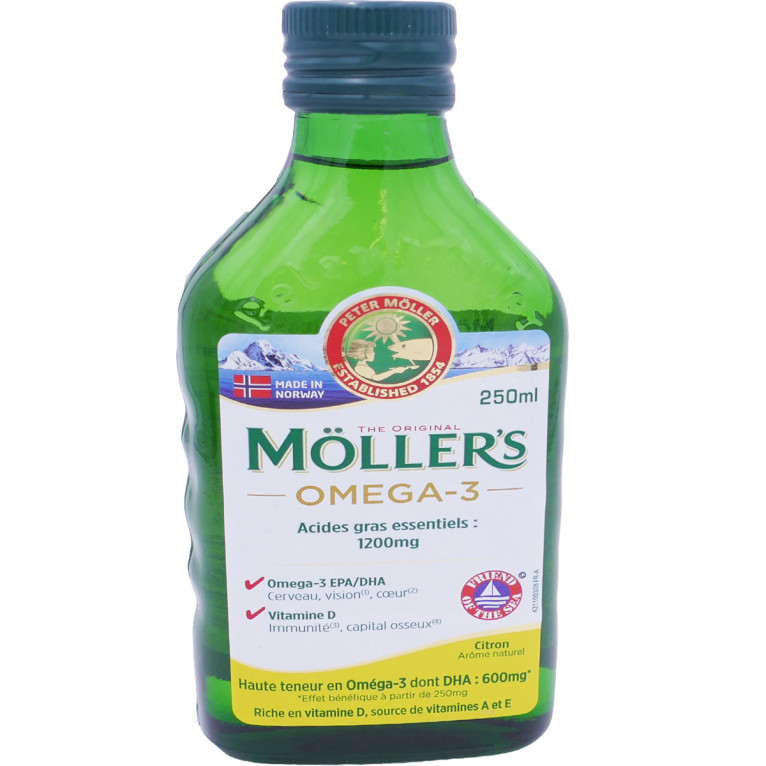 La marque Möller’s propose des complémentss alimentaires à base d’oméga 3 de haute qualité issu de l’huile de foie de morue principalement pour le bien-être de toute la famille au quotidien. OMEGA 3 est un complément alimentaire conditionné sous forme de solution buvale au citron, composé d’huiles de poissons sauvages naturellement riches en acides gras essentiels omégas 3. Cette huile concentrée en acide Eicosapentaénoïque (EPA) et acide Docosahexaénoïque (DHA), participe au fonctionnement normal du cœur mais également du cerveau et de la vision. Les vitamines A et D renforcent la formule pour assurer le maintien d'une ossature normale et participer au fonctionnement normal du système immunitaire.