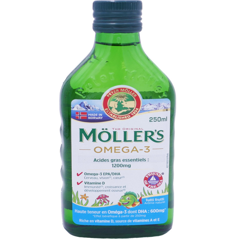 La marque Möller’s propose des complémentss alimentaires à base d’oméga 3 de haute qualité issu de l’huile de foie de morue principalement pour le bien-être de toute la famille au quotidien. OMEGA 3 Arôme Tutti Frutti est un complément alimentaire conditionné sous forme de solution à boire au goût de Tutti Frutti naturel, composé d’huiles de poissons sauvages naturellement riches en acides gras essentiels omégas 3. Cette huile concentrée en acide Eicosapentaénoïque (EPA) et acide Docosahexaénoïque (DHA) dosé à 600mg, participe au bon fonctionnement du cœur mais également au fonctionnement normal du cerveau et de la vision. Elle permet également d’agir sur l’équilibre de l’organisme pour retrouver le bien-être au quotidien. Les vitamines (dont la D) renforcent la formule pour assurer une ossature normale et participer au fonctionnement normal du système immunitaire.