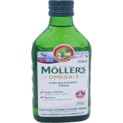 La marque Möller’s propose des compléments alimentaires à base d’oméga-3 de haute qualité issu de l’huile de foie de morue principalement pour le bien-être de toute la famille au quotidien. OMEGA-3 est un complément alimentaire conditionné sous forme de solution buvable au goût naturel, composé d’huiles de poissons sauvages naturellement riches en acides gras essentiels. Cette huile est concentrée en acide Eicosapentaénoïque (EPA) et acide Docosahexaénoïque (DHA) qui participent au fonctionnement normal du cœur mais également du cerveau et de la vision. Les vitamines A et D renforcent la formule pour assurer le maintien d'une ossature normale et participer au fonctionnement normal du système immunitaire.