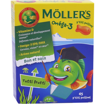 La marque Möller’s propose des complémentss alimentaires à base d’oméga 3 de haute qualité issu de l’huile de foie de morue principalement pour le bien-être de toute la famille au quotidien. OMEGA 3 Gommes est un complément alimentaire conditionné sous forme de « p’tits poissons » au goût de Tutti Frutti naturel, composé d’huiles de poissons sauvages naturellement riches en acides gras essentiels omégas 3. Cette huile concentrée en acide Eicosapentaénoïque (EPA) et acide Docosahexaénoïque (DHA), participe au bon fonctionnement du cœur mais également au fonctionnement normal du cerveau et de la visions chez l’enfant. Elle permet également d’agir sur l’équilibre de l’organisme pour retrouver le bien-être au quotidien. Les vitamines (dont la D) renforcent la formule pour assurer un développement osseux normal et participer au fonctionnement normal du système immunitaire.